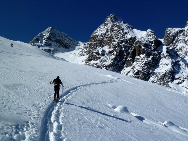 Tourenverhältnisse: Pulver von oben bis unten!! Besser als heute kann man diese Tour kaum erwischen - top Bedingungen nach den Neuschneefällen, sichere Verhältnisse bei LWS I bis II. In Der Abfahrt haben wir die direkte Variante genommen (vor der Plattigen Wand links runter, ging bestens).