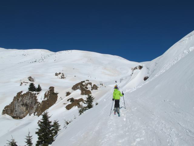Gefahreneinschätzung: Wegen der O-seitigen Exposition solte die Tour um 12 beendet sein, dann geringe Gefahr. Die Querung würde ich mittags auch nicht mehr machen, aber während wir abgefahren sind, sind immer noch welche aufgestiegen.