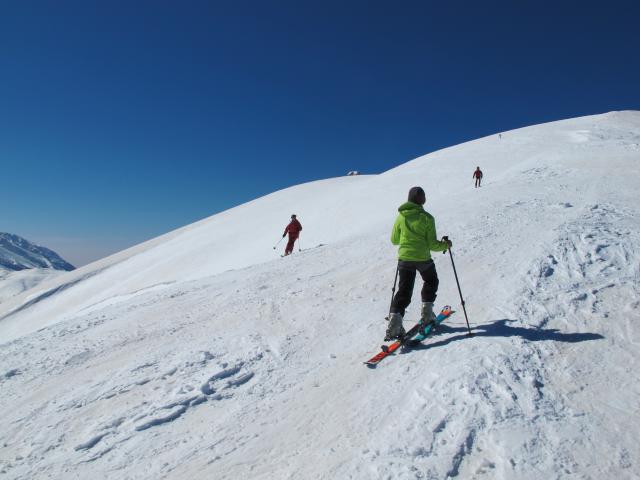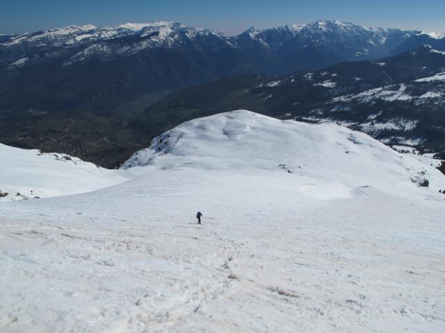 Wir haben bei der Abfahrt aus Sicherheitgründen die südseitige Querung gemieden und sind nach einem ganz kurzen Gegenanstieg (Anfellen lohnt nicht) über die sehr schönen Hänge des Monte Campo abgefahren.