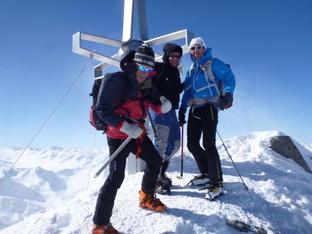 Tourenverhältnisse: Auffahrt mit Gondel zum Schaufeljoch, danach zunächst über Piste, dann im Gelände Abfahrt bis zum Anfellplatz, Aufstieg über windgepressten Schnee bis ins Skidepot, über guten Trittschnee auf Gipfel, insgesamt sehr windig