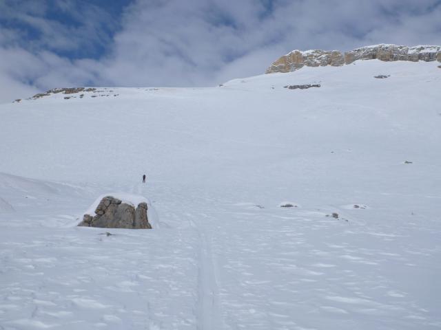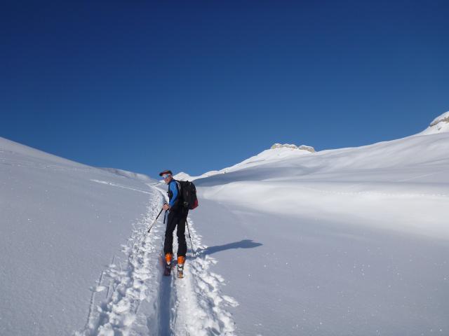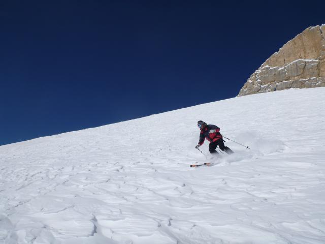 Tourenverhältnisse: Aufstieg wie in Tourentipp beschrieben, super Schnee, Gipfelhang etwas windgepresst, dennoch super zum Abfahren. Insgesamt perfekte Verhältnisse... klettersteig sind die Seile frei, dennoch für uns noch zu viel Schnee für Besteigung