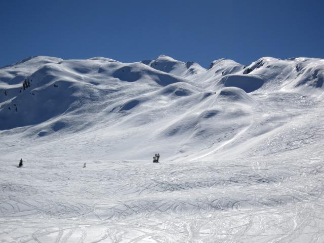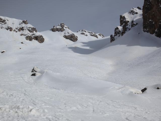 Gipfelhang hart; pistenmäßig eingefahren. Dann in leicht sulzigem Schnee weiter; gut zu fahren.
