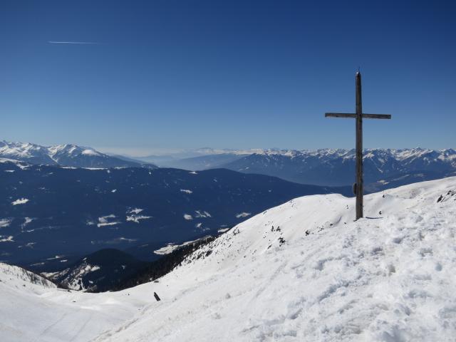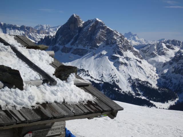 Abfahrt im leicht sulzigen Schnee; sehr gut zu fahren. Im Wald besser auf der Forststraße bleiben (unterste Hänge beginnen auszuapern). Brugger Schupfe jetzt im Winter geschlossen.