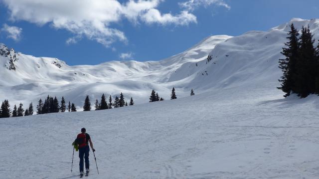 Genügend Schnee Nordseitig. Aufstieg wie in der AV - Karte eingezeichnet. Nach dem Waldgürtel überrascht ein liebliches hügeliges Gelände (Bild). Man sieht hier schon sein Ziel (rechts im Bild die 2 Gipfel). Überall im Schnee "Kuh-Muster", südseitig durch die Ausaperung, nordseitig durch den Sahara-Sand, von oben durch die Wölkchen am Himmel.