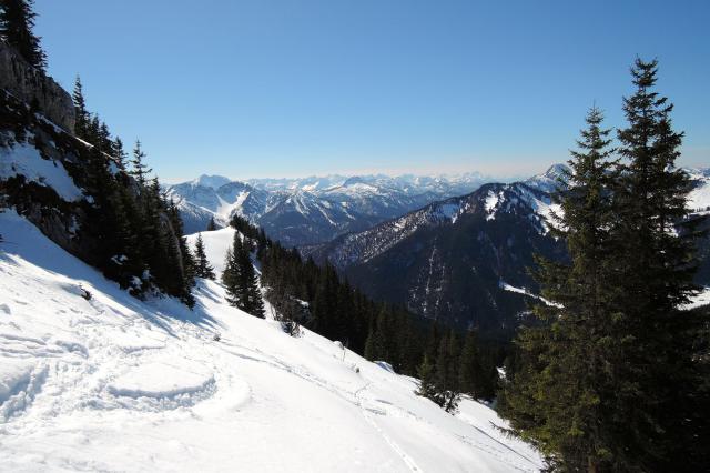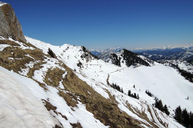 Sonstiges: Vom PP der Taubensteinbahn (1100m) zu Fuß über die Wurzhütte zur Bergwachthütte (1200m) am Klausgraben. In Ermangelung jeglichen Schnees auf der Forststrasse links der Forststrasse ins Gelände, angefellt und zum Oberen Maxlrainerlift. Diesen links liegen lassend zur Unteren Wallenburger Alm (1480m), von dort weiter in östlicher Richtung auf den Lämpersberg zu. Unterhalb des Grats – teils mit Skiern am Rucksack – nach Süden zur Rotwand hinüber gequert und auf deren Südseite entlang auf Schneeresten teils tragend zum Rotwandgipfel (1884m). Von dort wieder zu Fuß 150m abwärts (1820m), dann links durch die nur im unteren Drittel aufgefirnte Nebelrinne Richtung Großtiefentalalm. Auf 1540m wieder angefellt und Richtung NW zum Miesingsattel (1700m), abgefellt, runter an der Kleintiefentalalm vorbei, wieder angefellt (1520m) und hinauf zum Taubensteinhaus (1567m). Zuletzt noch zur Taubensteinbergstation (1580m) und über die Piste zum Ausgangspunkt. Der obere Teil des Zielhangs ist aper – abschnallen und tragen.