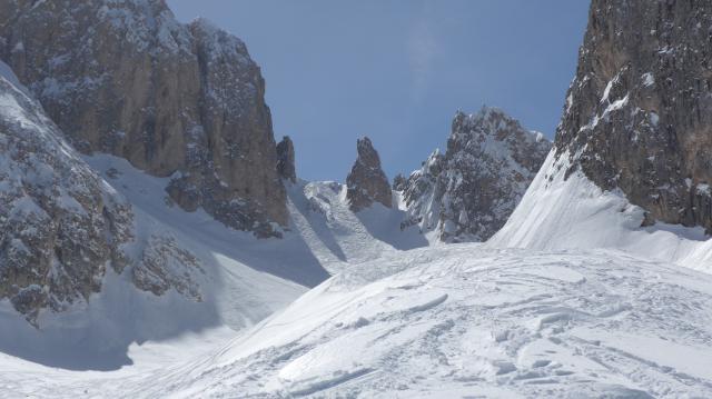Im Waldgürtel Bruchharsch, danach Pulver. Wunderschöne spannende Landschaft. Noch vor der Furcella della Neve (mit Wechte) viele steile nord-ostseitige Rinnen als Möglichkeit für Zugaben.