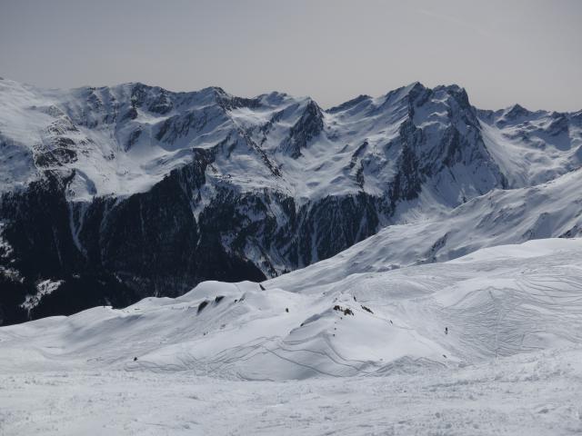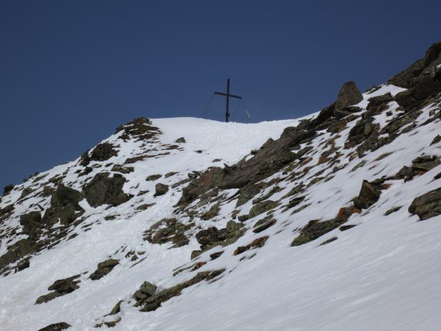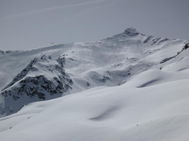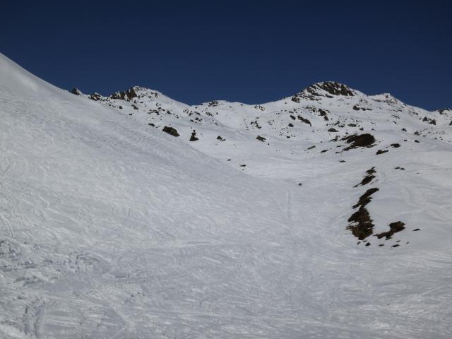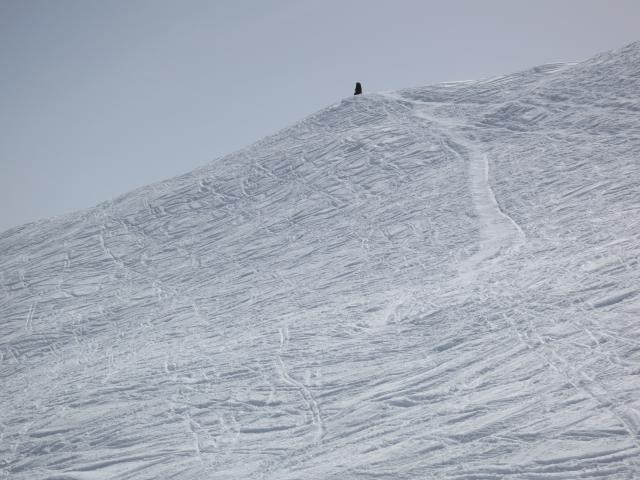Tourenverhältnisse: Am Parkplatz morgens (7:45) schon knapp über 0 Grad. Aufstieg bis Skidepot auf griffiger Spur oder daneben (keine Harscheisen nötig). Gipfelaufstieg problemlos zu Fuß (Trittspuren vorhanden). Abfahrt mittags: es gab im Wesentlichen weder schönen Pulver noch schönen Firn. Der Neuschnee von vor einer Woche war noch nicht richtig gesetzt, aber vom Wochenende her total verspurt (Standardroute). Natürlich gab's ein paar Firnabschnitte (dort, wo es pistenartig eingefahren war und auf der Rodelbahn) und ein paar wenige schon schwere Pulverschneeabschnitte (wo's schattig war).