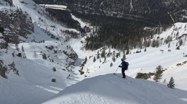 Abfahrt bis zur Forc. Verde im Pulver. Dann für die westseitige Variante mit guten Schneeverhältnissen (wechselnd, aber genussvoll zu fahren). Bevor sich das schöne Kar verengt, links (unbedingt!) gehalten, bis wir auf eine "typische Lawinenrinne" getroffen sind. Diese im immer weicher werdendem Schnee abgefahren ( von oben komplett einsehbar).