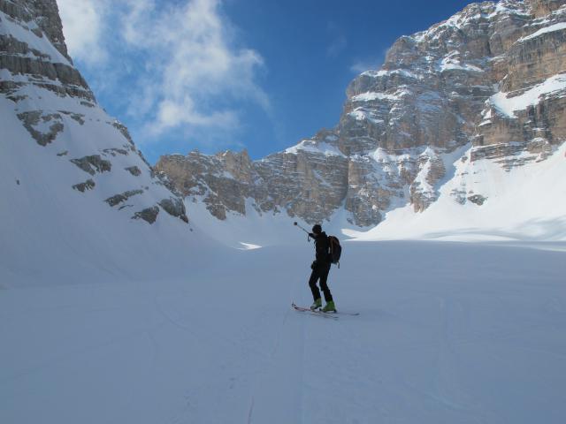 Tourenverhältnisse: Perfekt. Viel, viel Schnee. Bei der Abfahrt um 11.30 Uhr (besser noch eine halbe Stunde warten) ein toller Wechsel zwischen Butterfirn und Pulver und dazwischen noch ein paar wenige Stellen, die noch nicht weich waren. Landschaftlich großartige Tour.