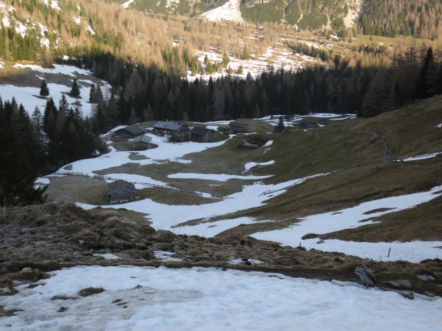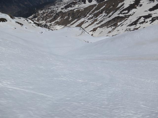 Prognose: Auf den Wiesen zwischen Parkplatz und See werden bald längere Tragestrecken entstehen. Zwischen See und oberhalb des Grubenjochs (das Joch selbst ist überwechtet) liegt noch sehr viel Schnee - da geht's noch eine Weile (Bild 2). Der letzte Steilaufschwung ist südseitig auch zu Fuß ohne Probleme, da bereits aper.