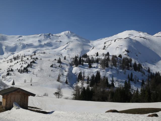 Tourenverhältnisse: Abfahrt mittags bis zum Obernberger See firnig bzw. leicht sulzig - ein echter Genuss. Der Fahrweg am See entlang zum Gasthaus ist aper. Danach kann man sich auf den Bauernwiesen noch bis kurz vor den Parkplatz hinuntermogeln (Bild 1; fotografiert im Aufstieg).