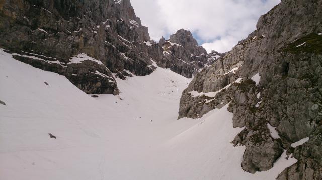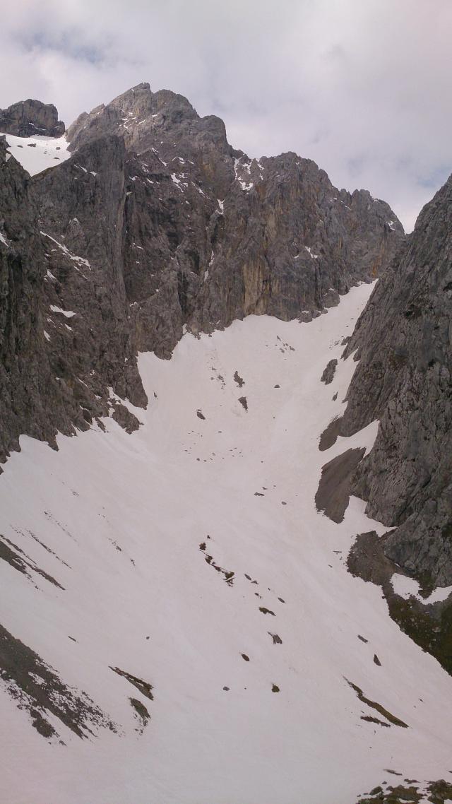 Gefahreneinschätzung: bei Erwärmung Gefahr von Rutschen + Steinschlag aus den Flanken, das meiste dürfte aber schon unten sein; das Kar selber ist fast immer stark eingefahren