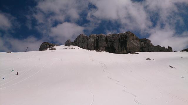Der Schnee beginnt für Aufstieg und Abfahrt beim Bankerl (1335 m). Unterhalb von ca. 1.500 m sind die Schneebänder allerdings teilweise schon sehr dünn und eng. In der Abfahrt war angesichts des nicht mehr tragenden Schnees hier Steinkontakt nicht zu vermeiden und die kurzen Brettl nicht schlecht. Ansonsten wären angesichts des insgesamt tiefen Schnees (meist kein guter Sommerschnee) die langen Latten sicherlich die bessere Wahl gewesen (was auch alle anderen wenigen Tourengeher so machten). Ohne Unterbrechung bis zum Tunnel und danach weiter bis kurz vor das Gipfelkreuz, zurück genauso. Vorderes Dammkar sah auch noch recht gut aus.