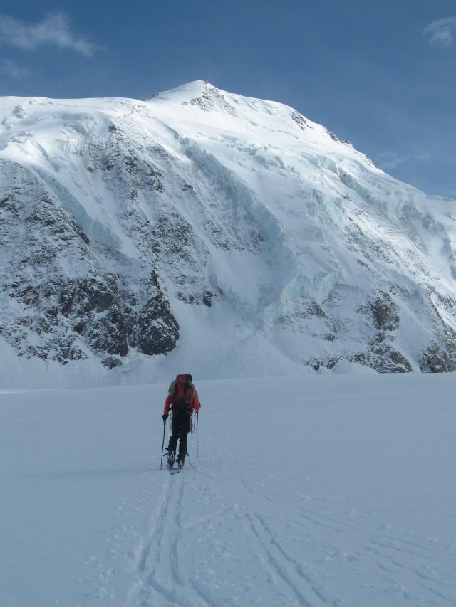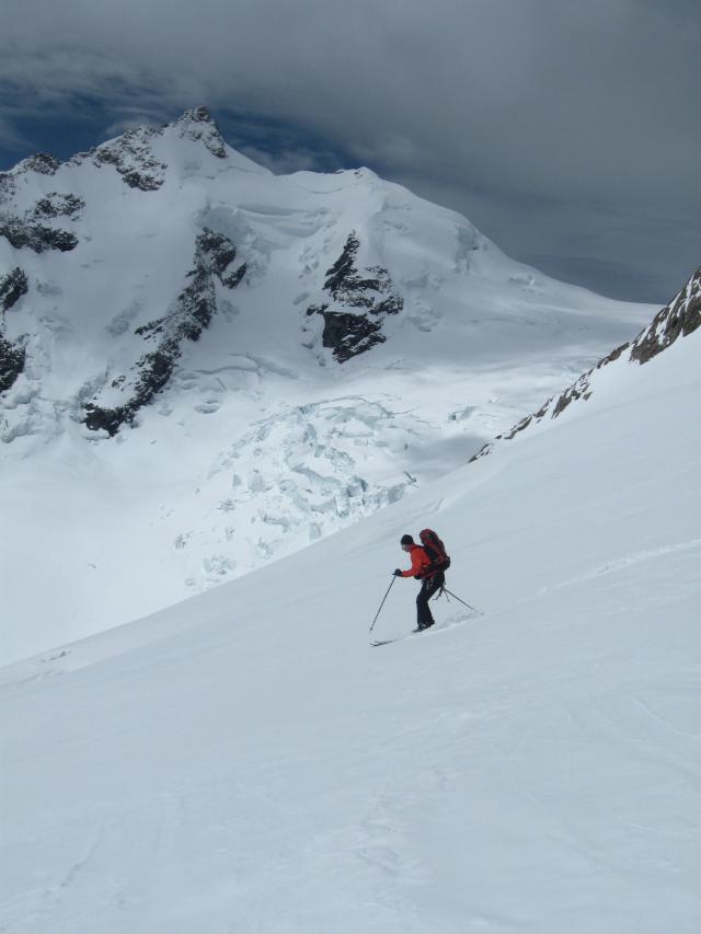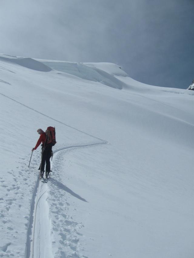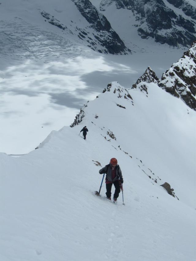 Wir fuhren am Donnerstag, 08.05., von München und wollten ursprünglich von der Fafleralp auf die Hollandiahütte aufsteigen. Da aber die Straße zur Alp wegen Bauarbeiten geschlossen war und uns der Weg von Blatten denn doch zu weit war, disponierten wir um und fuhren von Interlaken mit der Bahn aufs Jungfraujoch ("allein unter Asiaten" waren wir Exoten begehrtes Fotoobjekt). Von dort Abfahrt auf ca. 3250m und Aufstieg ins Louwitor. Abfahrt über den Kranzbergfirn , dessen Spaltenzonen man in Abfahrtsrichtung ganz links passiert, bis auf ca. 2950m. Anschließend Anstieg zur Hollandiahütte. Wetter am Do gut, abends zog es zu, Schnee nur weit oben noch pulverig, dann kurz weich und Bruchharsch.