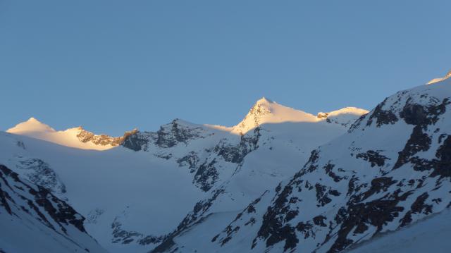 Start 6 Uhr. Der Blick von der Hütte auf den Gipfel verspricht eine allerfeinste Abfahrt. Sonnig.