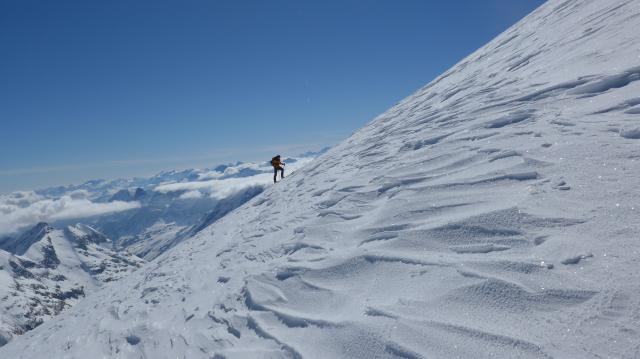 Unter dem Gipfelhang von links nach rechts gequert und mit den Skiern auf den Gipfel (hier mal ganz kurz sehr ausgesetzt). 10 Uhr