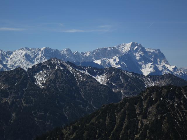 Tourenverhältnisse: Aufstieg über Ochsensitz und Ziegelspitze, Abstieg zum Gasthof Ettaler Mühle: die Wege der kompletten Rundtour waren vorwiegend trocken, kein Schnee und auch nur ganz wenige batzige Abschnitte. Das Wettersteingebirge schaut aber noch tief verschneit aus.