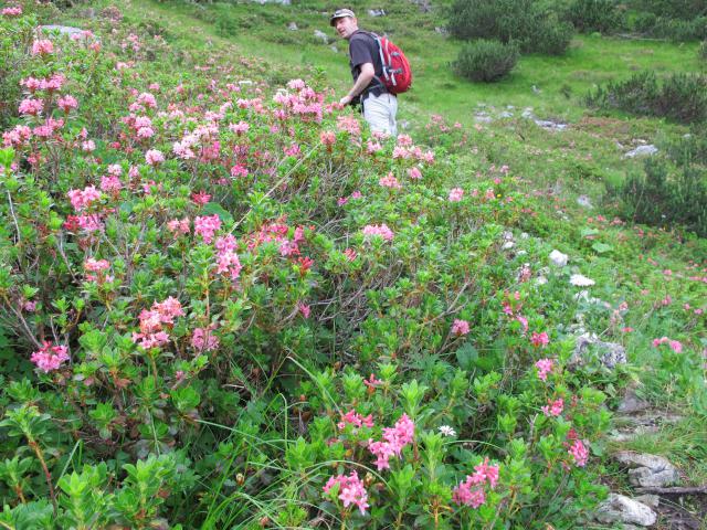 Tourenverhältnisse: Sehr schöne und einsame Tour, über die wir in kürze detailliert berichten werden. Wetter heute nicht so warm wie befürchtet, zunächst auch einige dickere Wolken, die für Schatten sorgten. Weg durchs Fuchsloch am Morgen noch stellenweise feucht, nur ganz kurze Stelle batzig. Ansonsten sehr gute Wegverhältnisse. Fernsicht für einen heißen Julitag auch ganz gut. Der Almrausch blüht hier noch sehr schön!!!