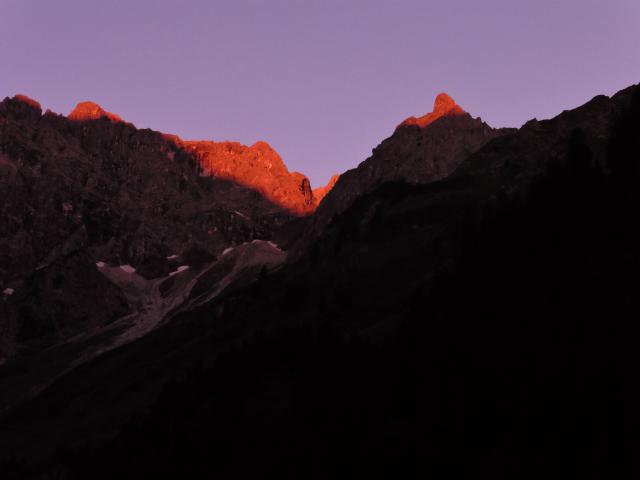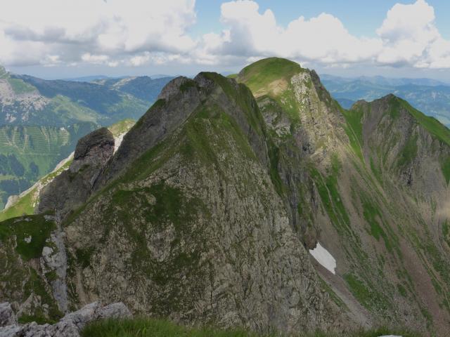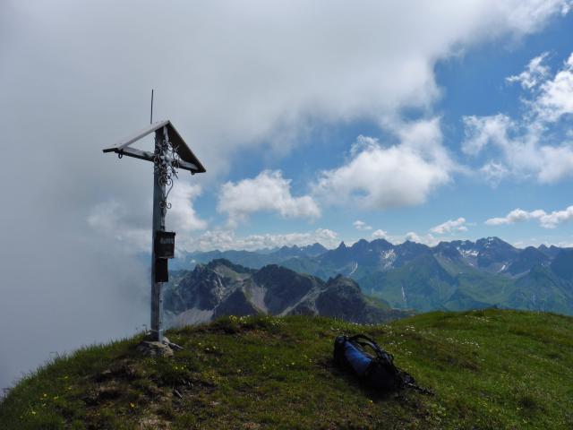 Sonstiges: nach über 50 Jahren noch einmal den Elfer bestiegen;- vom Parkplatz in Bödmen (Tageskarte 3 Euro) hinunter, über die Breitach und ins Gämsteltal zur Schönisbodenalpe; rechts des Baches beginnt ein Steig der zur Oberen Schönisbodenalpe leitet (heute total verschlammt); von der Hütte scharf rechts, über den Zaun zu einer kleinen Bretterbude; dort beginnen Steigspuren (mit Unterbrechungen), die immer leicht links aufwärts über 4 Bäche / Tobel (die letzten beiden sehr steil) auf den markanten Westrücken führen; danach geht es über die riesige Grasflanke - den steilsten Stellen geschickt ausweichend - auf den Verbindungsgrat - Zwölfer / Elfer; am Grat über eine kurze Steilstufe I+ auf den Elfer; dann weiter über das Runde Köpfle - erst ausgesetzt, dann ca. 20m Steilabstieg I - II (Achtung bei Nässe) in die Scharte vor den Liechelkopf (Abstieg ins Wildental möglich); erst über kurze Felsstufe nach rechts in Rinne; entlang eines rostigen Drahtes zu Felsstufe II+, dann nach links auf den Grat zum Gipfel; von diesem steil über Schotter und Gras in die Scharte vor dem Geishorn (Abstieg zur Schönisbodenalpe möglich); nach links unter den Felswänden auf Steigspuren hinunter zu dem Weg - Mindelheimer Hütte / Widderstein - und auf diesem über die Sterzerhütte und die beiden Gemstelalpen zurück zum Ausgangspunkt;