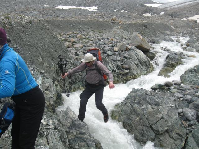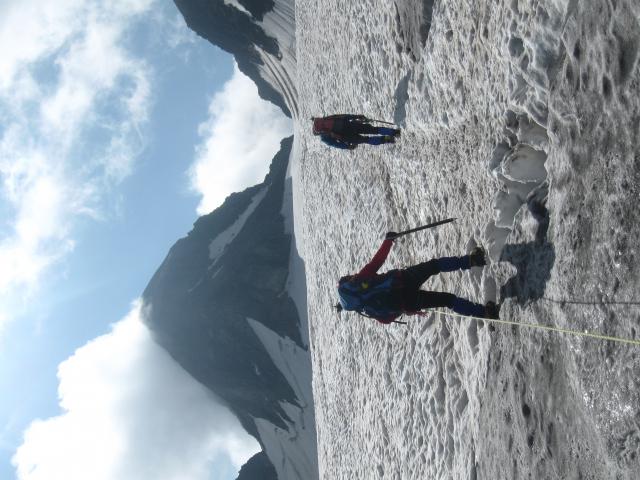 Gefahreneinschätzung: am Gletscher unten steiles Blankeis, oben viele Spalten