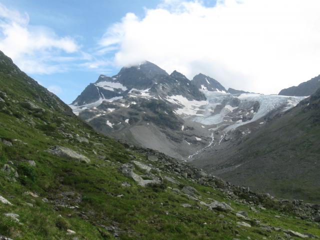 Am Sonntag Richtung Vermuntgletscher und vorher rechts ab und auf Steigspuren über mehrere Bäche springend (nicht ohne!) zur Grünen Kuppe queren; von dort leicht bergab zum hier flachen Gletscher. Diesen queren und anschließend über steiles Blankeis ansteigend weiter queren auf die andere Seite, bis der Altschnee beginnt. Sicheres Gehen mit Steigeisen wichtig. Der Rest ist eine "Autobahn" in weichem Schnee, garniert mit etlichen Spalten, bis zur Buinlücke. Von dort auf ausgeprägten Steigspuren (mehrere Varianten) schneefrei zum Gipfel. Zurück den gleichen Weg, wobei man wieder nach der geeignetsten Stelle für die Bachüberquerungen (keine Brücken oä.) suchen muss.