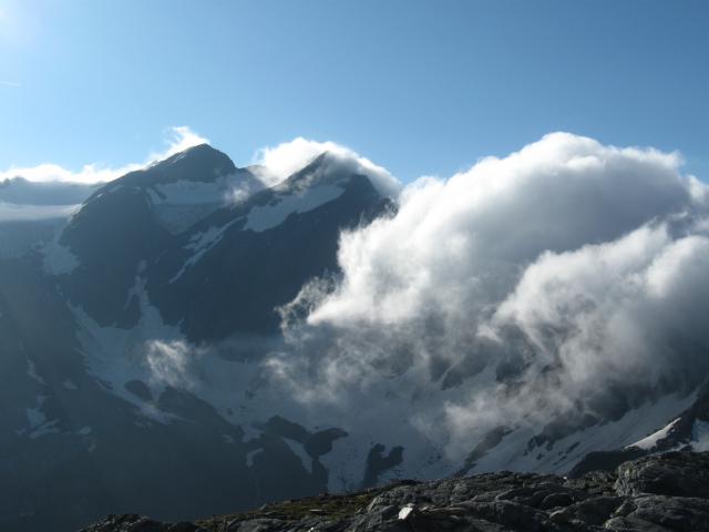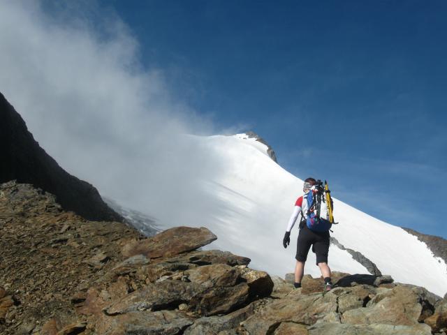 Sonstiges: Freitagabend Aufstieg zur Hütte. Samstag auf dem Normalweg von der Nürnberger Hütte auf den Wilden Freiger. Bis kurz unterhalb von P. 3127m praktisch schneefrei, dann am oberen Rand des Grüblferners (nordwestlichster Teil) weiter zum Signal- und Hauptgipfel. Guter Stapfschnee, kein Blankeis, wir brauchten keine Steigeisen. Mittlerweile existiert der Gletscher oberhalb von P. 3222m nur noch als Mischung von Schnee-/Eis- und Felsbändern, Gletscherspalten sind keine da, ein Anseilen deshalb nicht mehr notwendig. Am Verbindungsgrat vom Signal- zum Hauptgipfel noch viel Schnee (deutlich mehr als vor zwei Jahren Anfang Juli - breiter Firngrat). Abstieg wegen einfallenden Nebels auf dem gleichen Weg. Wetter vormittags sonnig, aber Gipfel am Hauptkamm ab ca. 10.00 in Wolken, später zog es ganz zu und begann ab ca. 14.00 zu regnen. Abends langsam aufklaren.