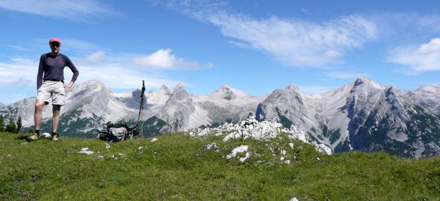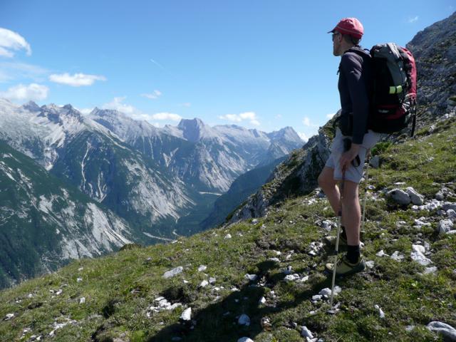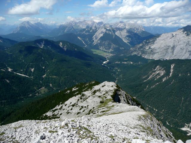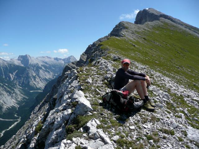 Tourenverhältnisse: Mit dem Bergradl über die Gleirschhöhe bis zum Abzweig Ochsenbodenweg, dort Radldeot und weiter zu Fuß die Forststraße rauf zum Bluetsgraben. Nach diesem zunächst weglos und später auf Pfadspuren zur Bluetssenke, weiter über den Westgrat (Kletterstellen I) zum Gipfel. Abstieg über Normalweg zur Amtssäge und 3 km zu Fuß zurück zum Rdldepot. Insgesamt 1600 Hm - prima Karwendeltour mit bester Aussicht auf dem Westgrat. Ab Bluetsgraben zunächst schwierige Wegfindung. Kein Gipfelbuch vorhanden (nur 1860-Plastiktüten). Außer uns kein Mensch unterwegs.