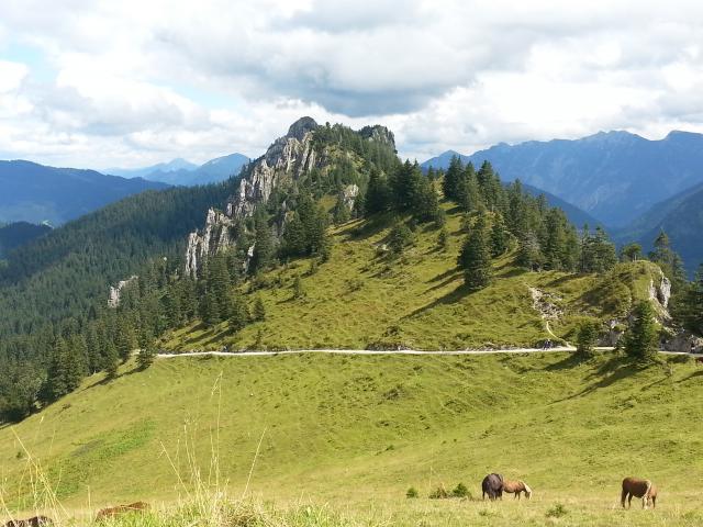 Oben wunderbare Aussicht mit etwas freundlicherem Himmel. Felszacken. Weidende Pferde. Nette Wirtsleut´. Schön!