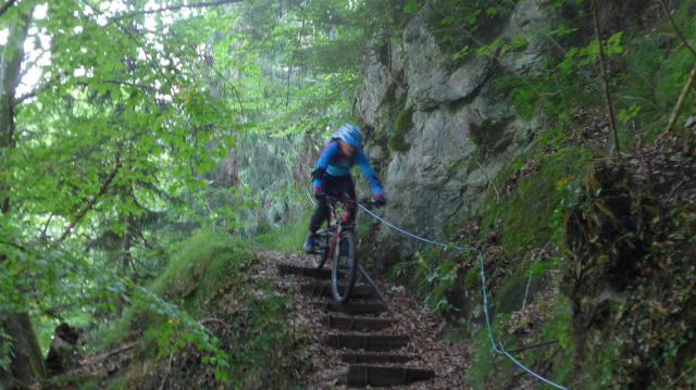 Einen Großteil wieder der Forststraße bei Sonne hinunter bis zur Hinteren Dalsenalm. Ab hier immer wieder kurze und etwas längere leichte Trails mit 1 - 2 schwierigeren Passagen, die man auch kurz schieben könnte.