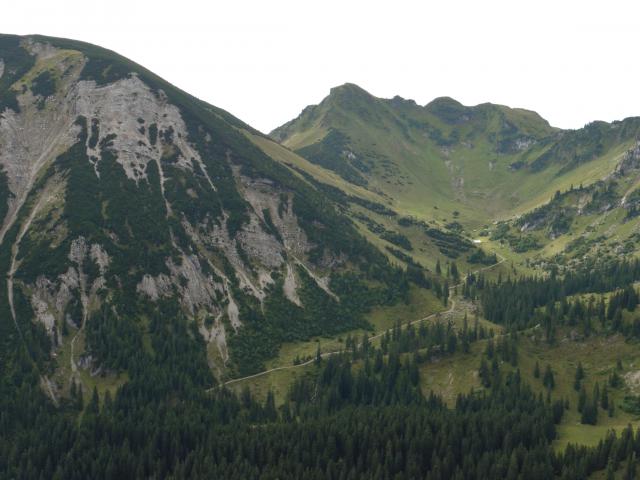 Sonstiges: von Geitau zuerst einige Meter auf dem Weg zur Aiplspitze, dann auf einem nicht bezeichneten Karrenweg links ab zu Wildfütterung; von dort auf Pfad, in angenehmer Steilheit hinauf, zur idyllisch gelegenen Angelalm; jetzt etwas steiler und ausgesetzt auf den Grat des Heubergs; wo der Pfad flach wird, rechts ab auf Steigspuren durch Wald und später durch Latschen immer am Grat zum Kleinmiesing; dann zuerst flach über Gras und später steiler durch Schrofen zur Aiplspitze;