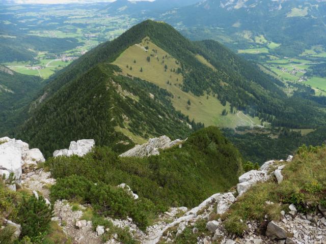 Der Abstieg erfolgt über den felsigen Nordgrat in eine markante Scharte; von dieser rechts abwärts zur Geitauer Alm und weiter zum Parkplatz;