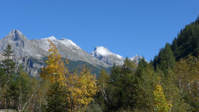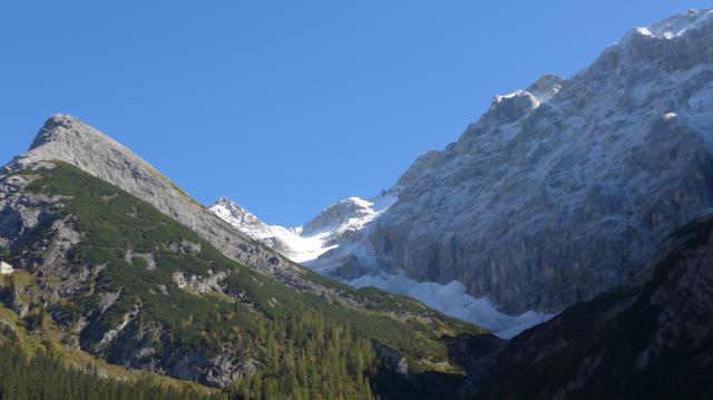Bei 5 Grad und blauem Himmel Richtung Rhontal gestartet (10:30 Uhr). Bald rechts Richtung Vereinalm (1406 m) abgebogen. Hier war´s noch schattig und kühl. Um so mehr auf die warme Sonne nach 1 Std. gefreut. Hier zwischendurch Waldarbeiten vorsichtig sein. Vereinalm sah zu aus. Weiter nach Mittenwald, Scharnitz und ins Karwendeltal eingebogen.