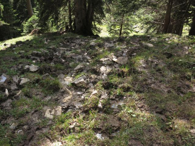 Tourenverhältnisse: über weite Strecken ist der Weg feucht, insbesondere zwischen Jagdhütte und 150 Hm unterhalb des Gipfels auch unangenehm batzig/rutschig, da gibt es auch wassergefüllte Viehtrittlöcher.