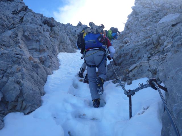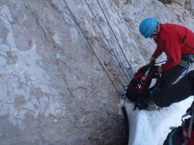 Tourenverhältnisse: insgesamt gut, am Gletscher Steigeisen notwendig, Randkluft zum Klettersteig kann gut über Schneebrücke überwunden werden (Bild 3), nach Scharte Eibseeblick etwas Schnee im Klettersteig (Bild 4).