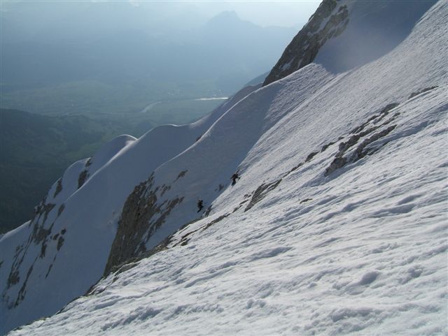 Wir waren heute zu dritt über die Ostwand am Göll. Zwei weitere Personen kamen nach. Die guten Verhältnisse vom Wochenende gab es vor allem in der Einfahrt nicht mehr: Jägersteig bis auf wenige Stellen am Beginn schneefrei und trocken; durchgehende Schneedecke ab Ende des Jägersteiges bzw. dort wo der Steig in das Kar mündet; trotz klarer Nacht und frühem Start (8:30 am Gipfel) meist kein tragender Harschdeckel; stark wechselnde Verhältnisse in der Wand - nur tlw. hart, zu Fuß Einsinktiefen bis tlw. über den Knöchel, Aufstieg mit Ski nur über den unteren Teil der breiten Rinne zu Beginn, dann weiter mit Steigeisen problemlos überwiegend in Trittschnee bis zum Gipfel. In der Einfahrt hart mit eingefrorenen alten Spuren, unterhalb der oberen Engstelle gut fahrbarer Feuchtschnee, im Wilden Freithof überraschernd gut fahrbarer Sulz.