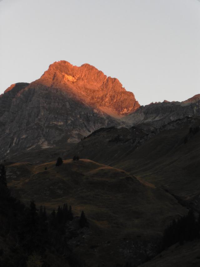 zu Bild 1: der Widderstein im Morgenlicht; die im Text erwähnte Scharte/Schlüsselstelle ist als kleiner Einschnitt erkennbar;