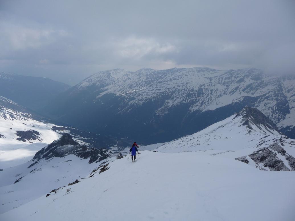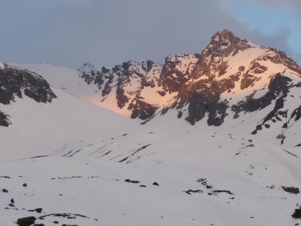 Tourenverhältnisse: Entgegen der Wetterprognose keine klare Nacht. Am Parkplatz um 6:00 hatte es +2 Grad. Der Schnee (beginnt bei der Talstation des Schlepplifts) war dementsprechend nicht gefroren. Erst etwas oberhalb der Schäfalm brach man nicht mehr ein. Ab hier gute Verhältnisse bis zum Skidepot. Der Gipfelaufschwung zu Fuß nicht ganz ohne wegen einer dünnen Neuschneeschicht, einige sind mit Steigeisen aufgestiegen. Abfahrt: oben diese dünne Pulverauflage auf hartem Untergrund, sehr schön fahrbar, weiter unten super Firn, ab ca. 2100m immer schlechter, am Ende schlimmster Sumpf.