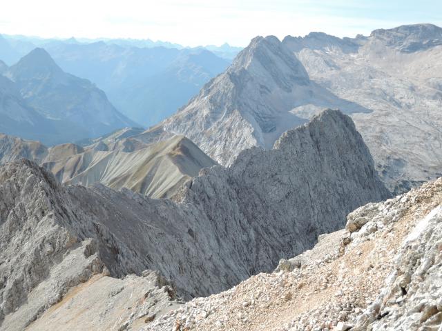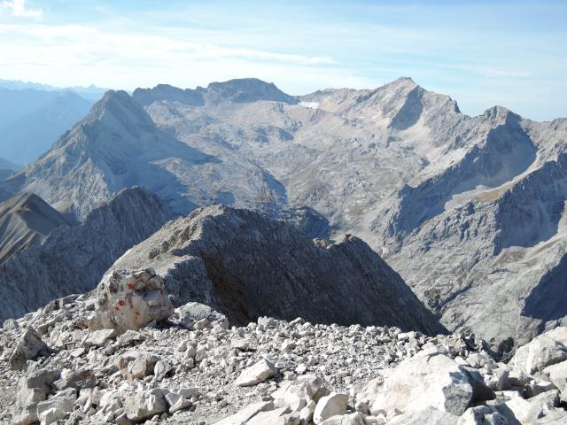Gestern mit meinem Bergkameraden Michael mit den Mountainbikes im Auto früh aufgebrochen Richtung Leutasch/Gaistal. Haben uns als Ziel den wenig bekannten Hochwanner ausgesucht, dem man sich zudem prima 700hm per MTB nähern kann um dann die restlichen ca.800hm zu Fuß zu bewältigen. Parken beim hintersten PP in der Leutasch wo die Touren um das Gaistal starten. Nach recht flachen Radlkilometern zu Anfang geht es ab der Gaistalalm dann doch ordentlich bergauf. Der obere Teil ist dann auch grobschottrig und steil aber noch problemlos fahrbar. Bei einer kleinen Hütte, wo der Fahrweg nach rechts zur neuen Rotmoosalm weiterführt sperrt man die Räder ab. Zu Fuß weiter auf den Sattel unterhalb des Predigtsteins und von dort immer ungefähr auf gleicher Höhe rüber Richtung Mitterjöchl. Bevor der Weg wieder bergab führt, verlässt man diesen und quert gerade oder auch leicht ansteigend hinüber bis man die Pfadspuren des Aufstiegs vom Mitterjöchl kreuzt. Nun steil aufwärts, den ersten Felsaufbau links umgangen, weiter über eine Schuttreiße, erreicht man einen weiteren Felsaufbau, den man mittig über einen Kamin (markiert mit einem großen W) in einfacher Kletterei durchsteigen kann. Nun zieht der Weg nach rechts (mit Steinmännern markiert) weiter bevor man über sehr lange und steile Schuttreißen zum Gipfel gelangt. Der Gipfel bietet unglaubliche Ausblicke auf Zugspitze, Jubiläumsgrat, Alpspitze sowie das Tal um Garmisch. Kaum zu verstehen dass sich hier kaum jemand rauf verirrt (gestern haben wir ganze 4! weiter Wanderer getroffen) und das Garmischer Gebiet mit Zugspitze, Alpspitze bei dem Wetter gestern von Wanderern wohl wieder überrant wurde. Andererseits ist es ganz gut so, dass so ein schönes Ziel kaum jemand begeht. Den zweithöchsten Gipfel Deutschlands.