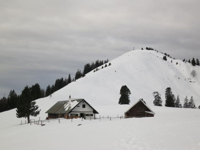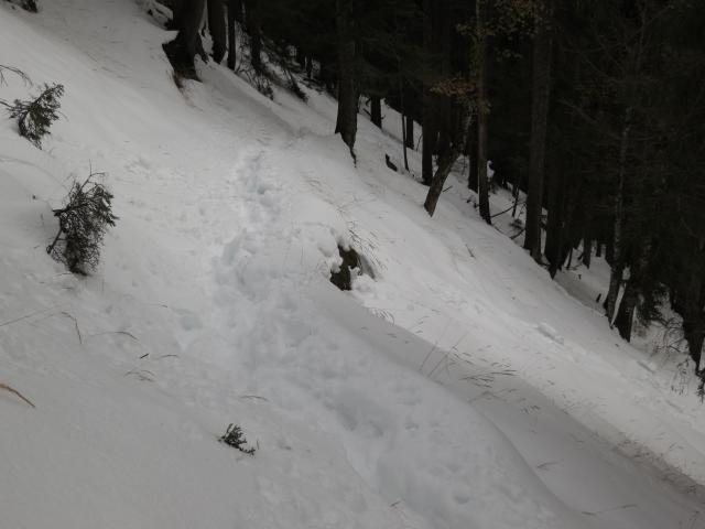 Tourenverhältnisse: Bis zu der Stelle, an der der Wanderweg von der Forststraße nach rechts abzweigt, lag kein nennenswerter Schnee. Im weiteren Verlauf waren es aber dann doch bis ca. 30 cm. Am späten Vormittag war es noch eine festgetretene Spur, die im Abstieg dann aber schon ziemlich feucht war (eingebrochen ist man aber nirgends). Die Bäume waren alle schon entladen (also keine "Nassschneelawinen" von oben).