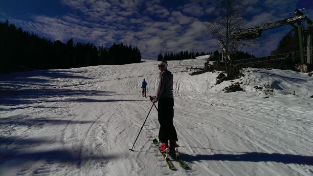 Tourenverhältnisse: Immer noch gute Verhältnisse, vom Parkplatz weg mit Ski möglich. Heute zum Fahren sogar noch besser als am Montag, da nicht so ruppig, Piste überwiegend firnig (13 Uhr).