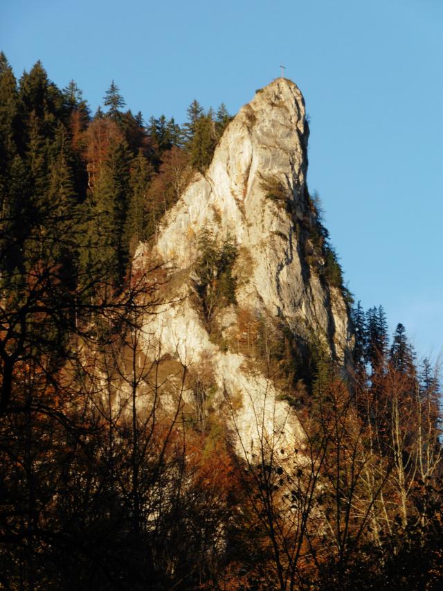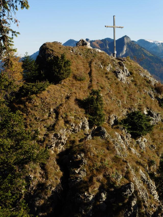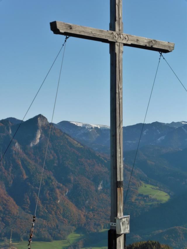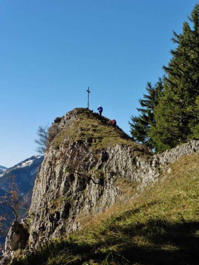 Sonstiges: Autobahnausfahrt "Brannenburg" , dann sofort links nach Flintsbach; am Ortsende - rechts ein weißer Wegweiser "Hoher Asten";dann noch 150m zu Parkplatz (kostenlos); von dort auf der Forststraße zum Berggasthof Asten; dann rechts (Wegweiser Riesenkopf) zur Riesenkopfalm; von der Alm rechts zum Waldrand (Weidezaunübertritt); unmittelbar dahinter eine rote Tafel "Maiwand-nur geübte Bergsteiger"; von dieser nach rechts auf Pfadspuren bergab in eine Scharte; dort nach links (Steinmann) steil und ausgesetzt durch den Wald bergab in eine weitere Scharte; aus dieser bergauf, am Grat rechts haltend abwärts und wieder bergauf bis zu einem Abbruch; dort muss man ca. 10m im Schwierigkeitsgrad II - III UIAA abklettern; dann unschwierig wenige Meter zum Kreuz; in diversen Tourenberichten wird von einem Fixseil an dieser Stelle gesprochen; dieses existiert nicht mehr; der gesamte Grat ist frei von Hilfsmitteln; allerdings habe ich in der letzten Scharte unmittelbar vor dem Gipfel schwache Steigspuren entdeckt, die aus dem Maigraben heraufführen; ergo muss es von dieser Seite einen kletterfreien Anstieg geben, der allerdings im Spätherbst sehr nass und batzig sein könnte; vom Gipfel auf gleichem Wege zurück zur roten Tafel und dann wieder auf markiertem Weg zum Riesenkopf; von diesem südwärts auf deutlichem unmarkiertem Pfad durch den Wald direkt zur Riesenkopfalm; die Alm überqueren und auf der anderen Seite weglos bergauf (rechts vom Bach) bis man am Waldrand den Weg zum Rehleitenkopf trifft; in wenigen Minuten nach rechts zum Gipfel; vom Rehleitenkopf auf dem spärlich markiertem, resp. überhaupt nicht vorhandenem Pfad zum Berggasthof Asten und auf dem bekanntem Weg hinab ins Tal.