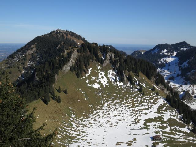 Tourenverhältnisse: Aufstieg über Wagneralm (Bild 1) und Jagdhütte (Bild 2): nur noch wenige Schneereste und auch nur wenige batzige Abschnitte. Abstieg vom Gipfel nach Osten (etwas mehr Schnee und auch etwas mehr Batz) und dann Rückweg über Feichteckalm und (wie bei der Skiroute) direkt durch den Wald (doch noch Einiges an Schnee) bis zum Verbindungsweg zur Schweiberer Alm (ab hier ohne Schnee) und dann mit kurzem Gegenanstieg (etwas batzig) zur Wagneralm und weiter zum Parkplatz. Insgesamt alles gut zu gehen.