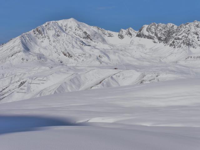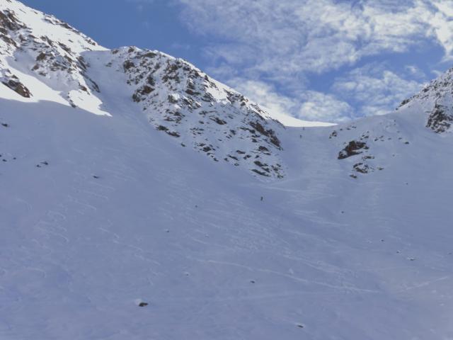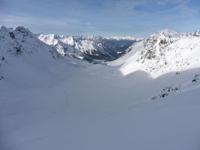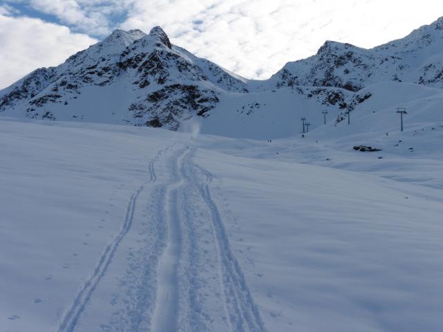 Sonstiges: vom Parkplatz weg auf der bereits präparierten Piste entlang der Dreiseenbahn hinauf zur Bergstation; von dort zuerst flach, später immer steiler werdend in zahlreichen Spitzkehren in die Scharte; die Abfahrt erfolgt entweder entlang der Aufstiegsspur oder man kann noch etwas am Grat in Richtung Gipfel aufsteigen und dann durch die nächste Steilrinne abfahren; weiter unten muss man nicht unbedingt die Piste benützen, - heute war es bis hinunter zum Parkplatz immer möglich, links oder rechts davon im Pulverschnee eine eigene Spur zu ziehen;