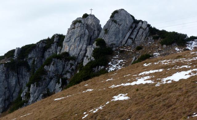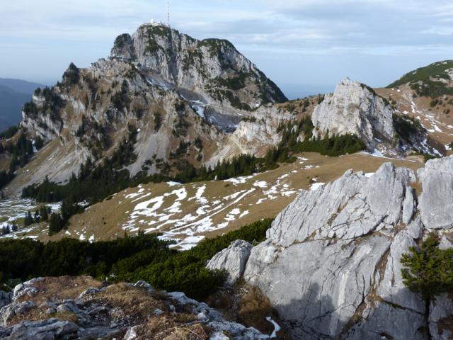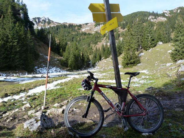 Tourenverhältnisse: Mit dem MTB auf der aspaltierten Almstraße (beginnt direkt vis-a-vis der Straßenabzweigung zum Waldkopf-Parkplatz am Sudelfeld) über die Schweinsteiger-Alpe bis zum großen Wendeplatz hinter kurz nach der Lacheralm; dort Radldepot. Straße komplett aper und trocken. Nun die Fuß auf teil etwas batzigem Steig zur Lacherspitze. Kleine Schneefeldreste am Wegesrand (manchmal besser zu gehen als der Batz).