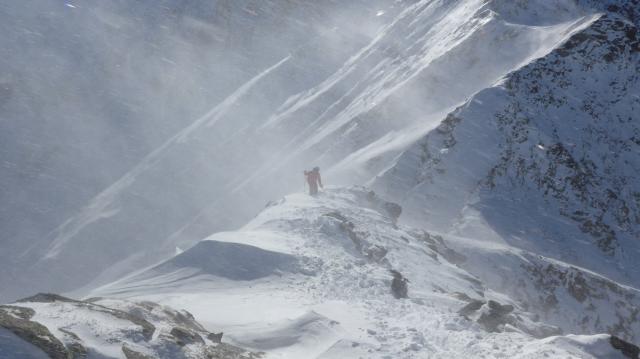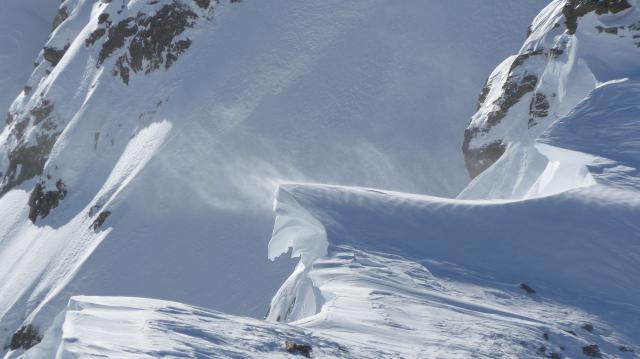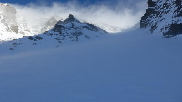 Ab der Scharte sehr starker Wind mit bissisgen Schneeverwehungen. Gute Spur.