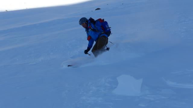 Nochmal vom Kessel in die östliche Rinne aufgestiegen. Leicht plattiger Pulver noch schön zu fahren.