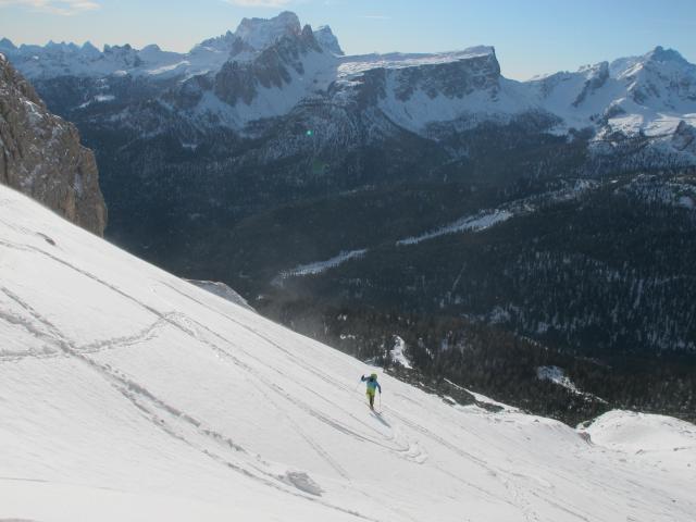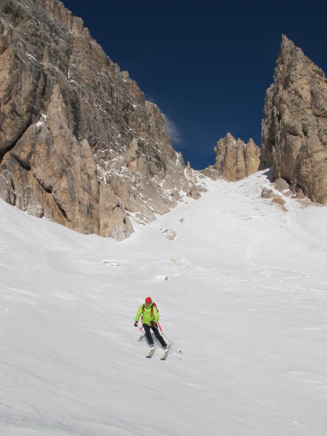 Tourenverhältnisse: Heute starker Wind, die Schneedecke entprechend hart von Sonne und Wind. Dennoch haben wir bei der Abfahrt ein paar windgeschütze Stellen gefunden, wo es richtig gut ging. Ansonsten tragende Harschdecke.