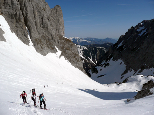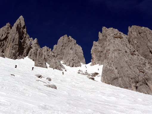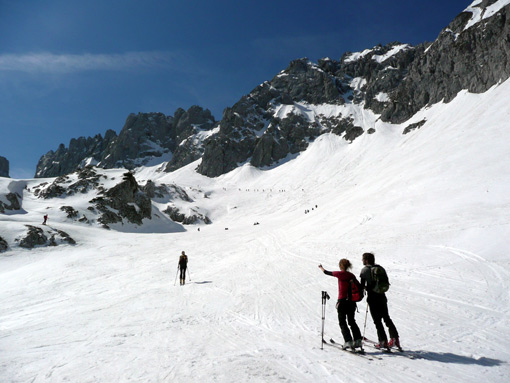 Sonstiges: Erstaunlich, dass um 12 Uhr bei der Wärme immer noch Leute aufbrechen. Insgesmt wahnsinnig viele Tourengeher unterwegs (ca. 400), trotzdem hat es sich gut verteilt. Nur im Osthang vom Törl runter kam es zu Kollisionen zwischen Aufsteigern und Abfahrern (einer ist gestürzt, hat einen anderen fast umgerissen).