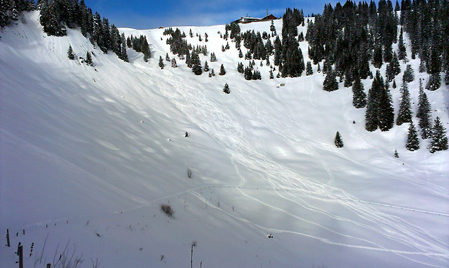 Tourenverhältnisse: Sehr gut! Fett Schnee, keine sharks, noch unverspurtes Gelände, Sonne und angenehme Temperaturen. In Schattenlagen bester Pulver, sonnseitig hat der Schnee heute einen Stich bekommen. Im Aufstieg wie in der Abfahrt fast nix los, dafür an der Bergstation die Hölle.
