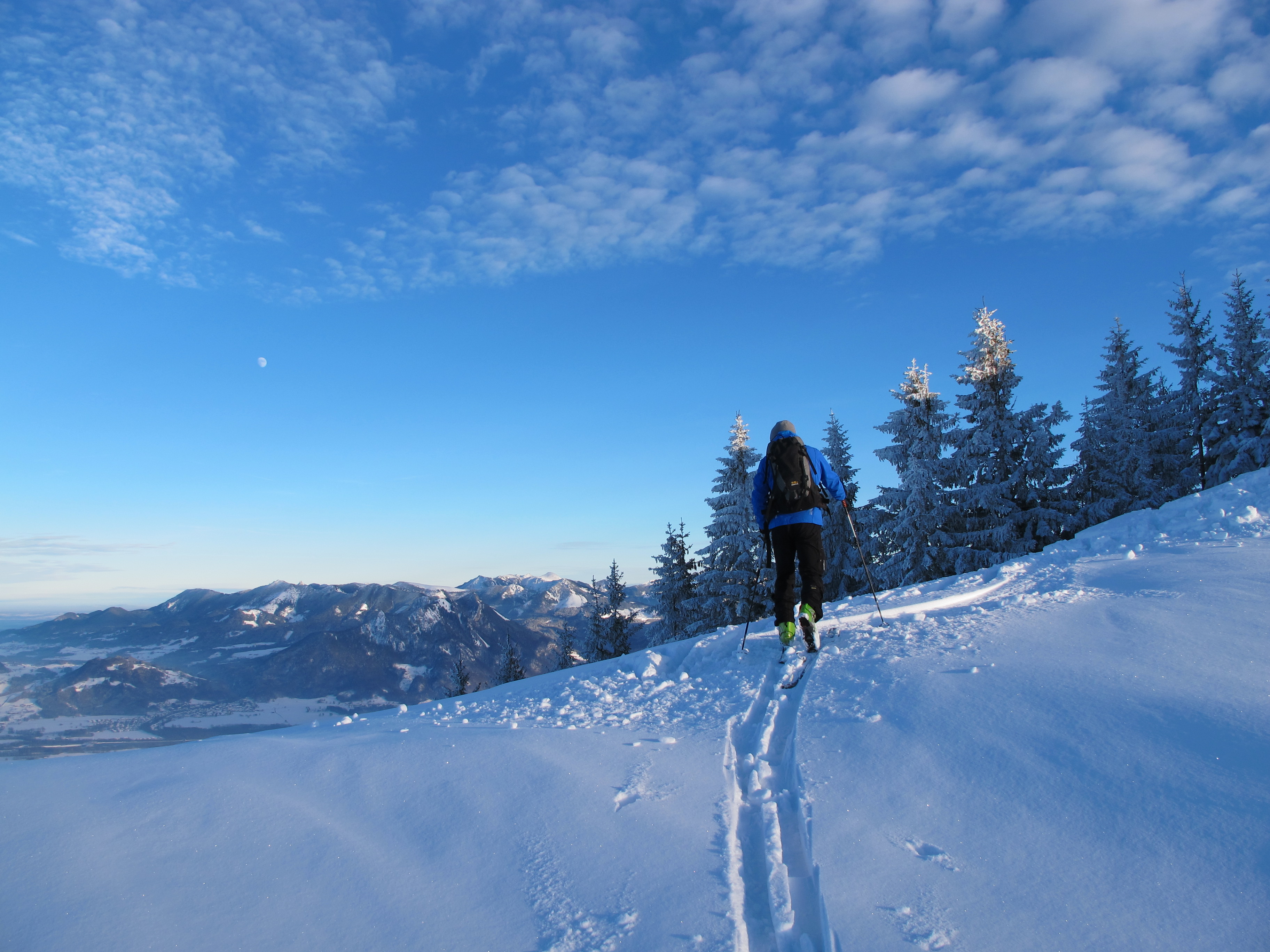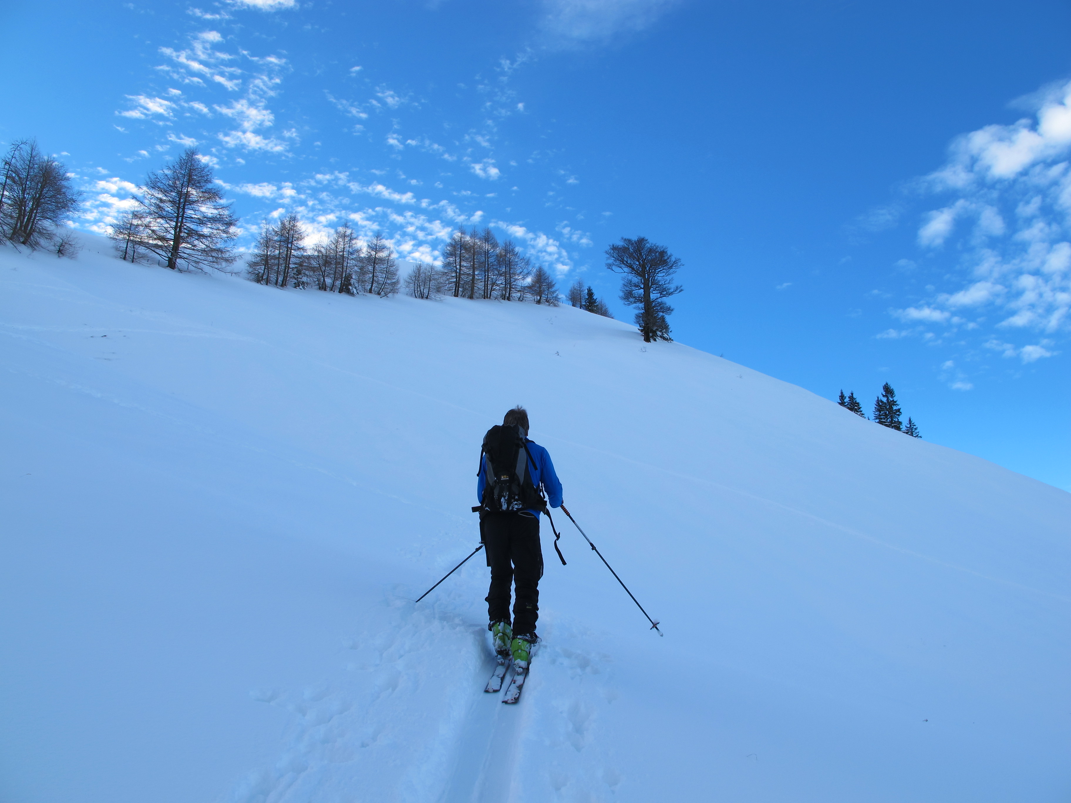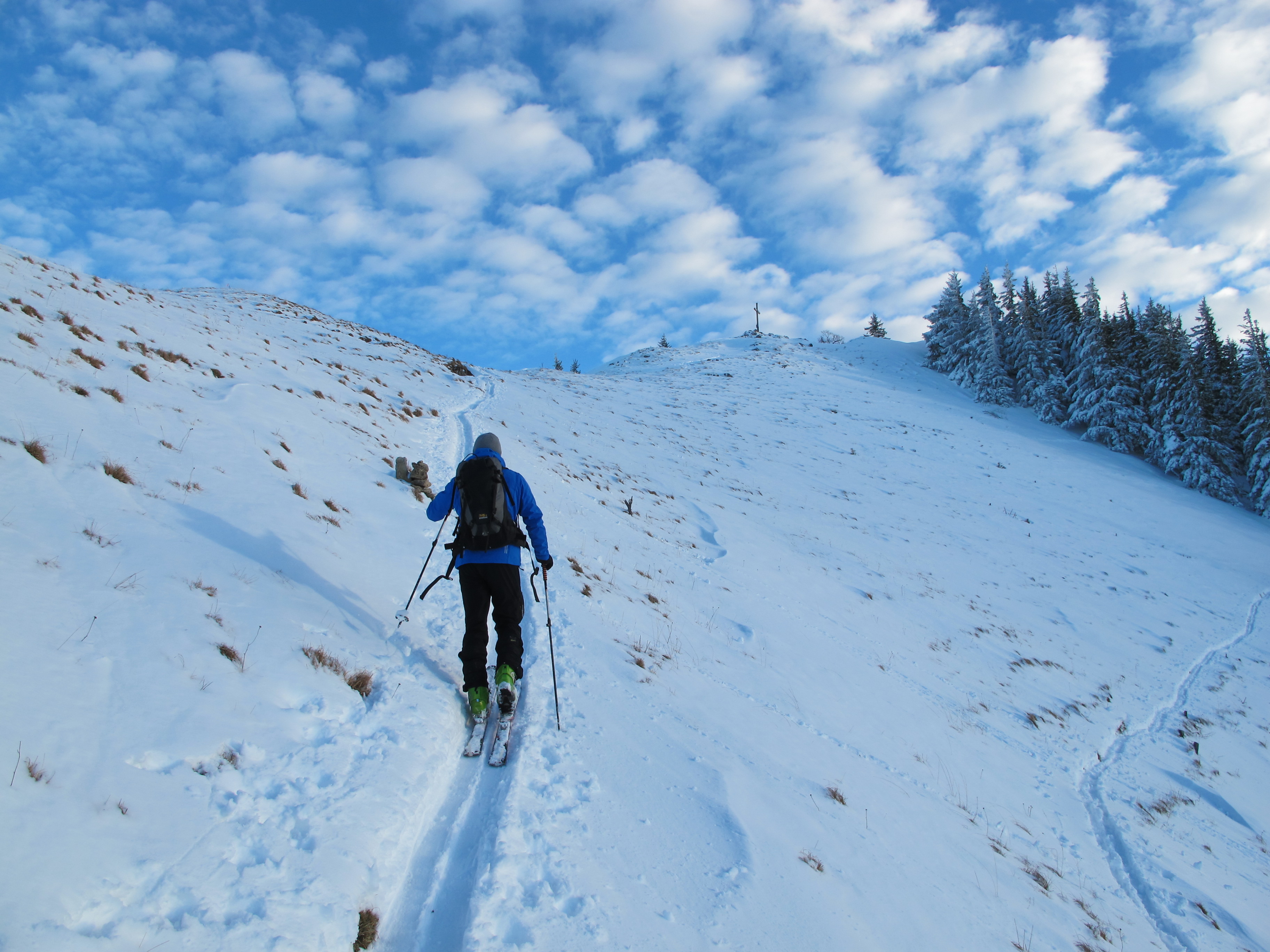 Tourenverhältnisse: Wir sind nicht vom üblichen Wanderparkplatz (Schuhbräualm) gestartet, sondern schon unten im Tal. Die Bauernwiesen waren so schön verschneit, dass wir uns diese makelosen Wiesenhänge nicht entgehen lassen wollten. Dann über die gut eingeschneite Forststraße zur Schuhbräualm und weiter auf dem kleinen Hohlweg zur Schlipfgrubalm. Die Hänge um die Rampoldalm waren dann entweder ziemlcih abgeblasen oder stark eingeweht und nicht ungefährlich. Ich hatte also bedenke was die Abfahrt anging. Am Gipfel eröffnet sich dann jedoch eine Direktabfahrt nach Norden und die bot erstaunlich tolle Schneeverhältnisse.